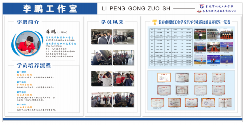 本着“崇德尚技,知行合一,存匠心;勤学苦练,精益求精,立匠志;百折不挠,脚踏实地,做匠人”的建设理念,2023年11月成立以长春悦迪汽车服务有限公司总经理-我校98级优秀毕业生李鹏为导师的李鹏名师工作室,吸纳优秀学生,历经技能培养、社会服务、有偿劳动、推荐就业4个阶段培养,现已完成5期培养,有效实现校企双元育人新模式。